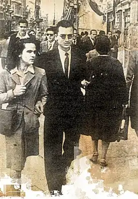 ![]() Зисис Скарос со своей женой, в день своего собственного освобождения и освобождения греческой столицы силами Народно-освободительной армии Греции, 12 октября 1944 года | |
