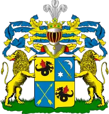 На щите дворянский коронованный шлем. Нашлемник: три страусовых пера. Намёт на щите голубой, подложенный золотом. Щит держат два льва.