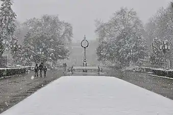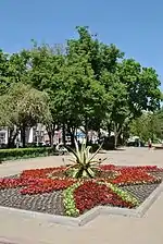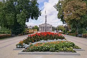 Цветник с видом на Монумент Независимости и театр имени Шевченко