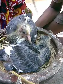 - Oxford English Dictionary указывает на самое раннее использование слова в 1640 г. в значении «молодая птица», а в 1694 г. — в значении «молодой голубь».