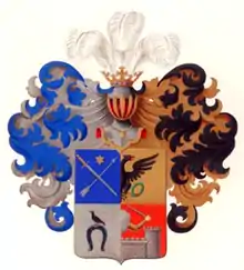Щит увенчан дворянскими шлемом и короною. Нашлемник: три серебряных страусовых пера. Намёт: справа — лазоревый, с серебром, слева — чёрный, с золотом.