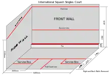 Площадка для игры в сквош — это игровая площадка, окруженная четырьмя стенами. Поверхность корта содержит переднюю линию, отделяющую переднюю и заднюю часть корта, и половину корта, отделяющую левую и правую стороны задней части корта, создавая три «коробки»: переднюю половину, заднюю левую четверть и задняя правую четверть.