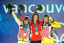 Олимпийский пьедестал в женском скелетоне (слева направо): Керстин Шимковяк, Эми Уильямс и Аня Хубер