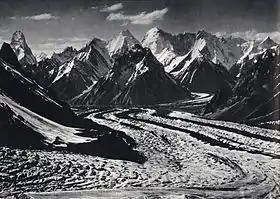 ![]() Вид с ледника Балторо. Скил-Брум - справа в центре. | |