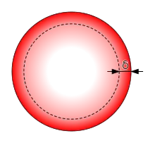 Плотность тока максимальна у поверхности проводника. При удалении от поверхности она убывает экспоненциально и на глубине становится меньше в е раз (примерно на 70 %). Эта глубина называется толщиной скин-слоя и на основании приведённого выше равна: