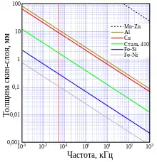 Если проводник имеет ферромагнитные свойства, то толщина скин-слоя будет во много раз меньше. Например, для стали (= 1000) = 0,74 мм. Это имеет значение, например, при электрификации железных дорог, поскольку там стальные рельсы используются в качестве обратного провода.