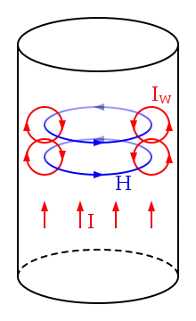 Рассмотрим цилиндрический проводник, по которому течёт ток. Вокруг проводника с током имеется магнитное поле, силовые линии которого являются концентрическими окружностями с центром на оси проводника. В результате увеличения силы тока возрастает индукция магнитного поля, а форма силовых линий при этом остаётся прежней. Поэтому в каждой точке внутри проводника производная направлена по касательной к линии индукции магнитного поля и, следовательно, линии также являются окружностями, совпадающими с линиями индукции магнитного поля. Изменяющееся магнитное поле по закону электромагнитной индукции: