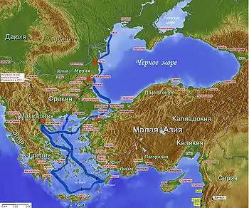 Основные сражения Скифской войны развернутся на территории Фракии, Мёзии, Македонии и Греции. В 46 году император Клавдий преобразовал бывшее Одрисское царство, населённое романизированными фракийцами, в римскую провинцию Фракия (совр. южная часть Болгарии). Ещё раньше была образована провинция Мёзия (позже Нижняя Мёзия), занимавшая территорию к северу от Фракии до Дуная (совр. северная часть Болгарии и румынская Добруджа). Греческие города на западном побережье Чёрного моря входили в состав обеих провинций, сохраняя местное самоуправление и право чеканки собственных монет.