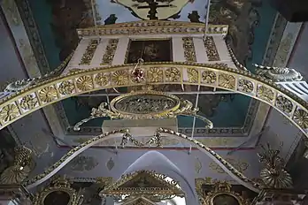 Сохранился богато украшенный алтарь в виде триумфальной арки, характерной для позднего классицизма, когда реальная архитектура иконостаса стала доминировать над живописью и скульптурным декором. Истоком мотива триумфальной арки в архитектуре иконостаса считается схема иконостаса Петропавловского собора в Санкт-Петербурге. Подобный тип получил широкое распространение в первой трети XIX в. По-видимому, иконостас Казанской церкви следует относить к концу 10-х годов XIX в.[9] В нем сочетаются черты классицизма и барокко (это использование волют в верхнем ярусе, ажурная, утонченная резьба, растительные гирлянды). Схожий тип иконостаса мы видим в расположенной в 180 км от Скнятиново Троицкой церкви села Верхне-Никульское Некоузского района (1816). Включение триумфальной арки в архитектуру иконостаса связывают с "самобытным претворением" темы победы в Отечественной войне 1812 г.[10] Отсюда возникает целый ряд иконостасов, датируемых 1810-1830-ми годами. Например, церковь Флора и Лавра в селе Ярлыково Ивановской области (1830 г.). В таком случае, мы предполагаем, что в Маклерской книге[11], сведения из которой приведены выше, речь идет о более раннем иконостасе, так как для 1803 года подобный тип и характер декора были бы слишком новаторскими.