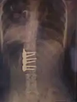 ![]() Рентгеновский снимок позвоночника пациента со сколиозом с правосторонним искривлением в поясничном отделе и левосторонним искривлением в грудном отделе позвоночника. | |