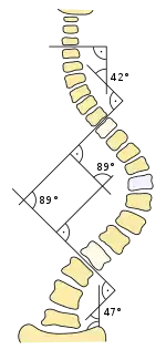 Измеряется угол между двумя линиями, проведёнными через центр наиболее отклонённого позвонка и через центр ближайшего неизменённого. Сколиоз может быть С-образный (с одной дугой искривления), может быть S-образный (с двумя дугами искривления) и Σ-образный (с тремя дугами искривления). В таком случае тяжесть состояния определяется по искривлению с наибольшим углом отклонения позвоночника.