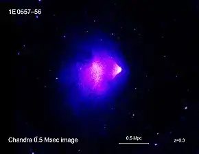 - CXO: 1E 0657-56: NASA Finds Direct Proof of Dark Matter Изображение в рентгеновских лучах, видимом излучении и распределение тёмной материи