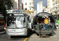 - На некоторых системах остановки напоминают станции рельсового транспорта: они закрыты со всех сторон, имеют билетные и справочные кассы, оборудованы турникетами (что способствует более быстрой посадке пассажиров в автобус, поскольку проверка и покупка билетов осуществляется до посадки в автобус);
