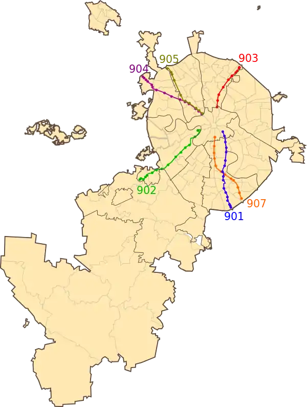 | 902 | Юго-Запад | Улица Федосьино — | Боровское шоссе, Мичуринский проспект, Бережковская набережная | Отменён в связи оптимизацией маршрутной сети в районе МГУ и Киевского вокзала, а также дублирования Солнцевской линией метро. |