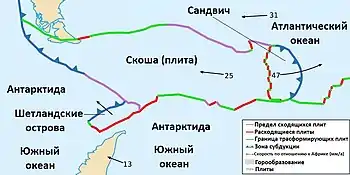 С севера и юга плита ограничена трансформными разломами. В восточной оконечности плита Скоша имеет срединно-океанический хребет и Южно-Сандвичевую микроплиту. Южноамериканская плита испытывает субдукции под восточный край Южно-Сандвичевой микроплиты, что, возможно отделило её от плиты Скоша — образуя обратную островную дугу. Западная граница с Антарктической плитой плохо изучена.