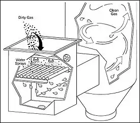 Простейший скруббер Вентури включает трубу Вентури и прямоточный циклон. На рис. 1 показана классическая конфигурация скруббера Вентури.[1]