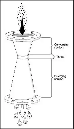 Скруббер Вентури состоит из трёх секций: сужающейся секции, небольшой горловины, и расширяющейся секции.