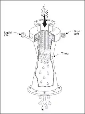 Поскольку газ вынужден двигаться с очень большими скоростями в небольшой горловине, то здесь наблюдается большая турбулентность потока газа. Эта турбулентность разбивает поток жидкости на очень большое количество очень мелких капель. Пыль, содержащаяся в газе, оседает на поверхности этих капель. Покидая горловину, газ, перемешанный с облаком мелких капель жидкости, переходит в расширяющуюся секцию, где скорость газа уменьшается, турбулентность снижается и капли собираются в более крупные. На выходе из скруббера капли жидкости с адсорбированными на них частицами отделяются от потока газа.