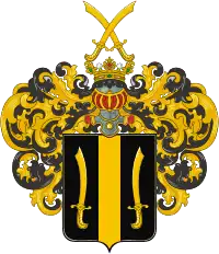 В чёрном щите золотой столб. По его обеим сторонам, друг против друга два золотых изогнутых меча.