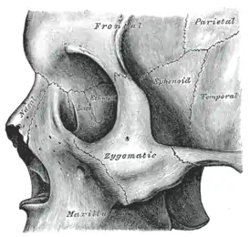Скуловая кость (лат. os zygomaticum) — парная кость лицевого черепа. Соединяется с лобной, височной костями (посредством лобного и височного отростков), большим крылом клиновидной кости и верхней челюстью. Участвует в формировании латеральной стенки глазницы и подвисочной ямки. Вместе со скуловым отростком височной кости формирует скуловую дугу, являющуюся латеральной границей височной ямки. Помимо отростков, в скуловой кости различают латеральную, височную и глазничную поверхности. На глазничной поверхности имеется скулоглазничное отверстие, которое ведёт в канал, открывающийся скулолицевым отверстием (на латеральной поверхности кости) и скуловисочным отверстием (на височной поверхности).