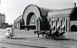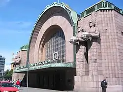 В 1901 году был объявлен архитектурный конкурс на проект нового здания выборгского железнодорожного вокзала. Победил проект архитектора Элиэля Сааринена, который совместно с зодчим Германом Гезелиусом построил к 1913 году новое гранитное здание в стиле национального романтизма. Силуэт и оформление здания имели много общего с Хельсинкским вокзалом, возведённым теми же архитекторами. Но, если фасад вокзала в Хельсинки украшен изображениями исполинов со светильниками работы Эмиля Викстрёма, то на фасаде выборгского вокзала скульптором Евой Гюльден были размещены изваяния двух женщин с венками, у ног которых располагались две пары медведей. По мнению мнению искусствоведа Е. Е. Кеппа, эта композиция символизировала победу духа над материей.