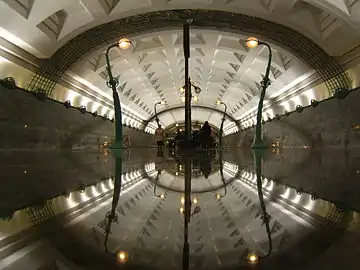 Станция украшена металлическими элементами в стиле модерн, вдохновлёнными входами Эктора Гимара Парижского метрополитена. В больших углублениях свода размещены кованые металлические орнаменты из листьев и ветвей (автор И. Лубенников). Свод кессонированный; он накрывает платформу станции и восточный вестибюль. Светильники установлены на путевых стенах так, чтобы освещался весь свод станции.