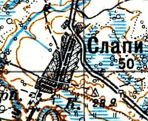 СЛАПИ — деревня владельческая при реке Луге, число дворов — 23, число жителей: 98 м. п., 92 ж. п.; Часовня православная[9]. (1862 год)