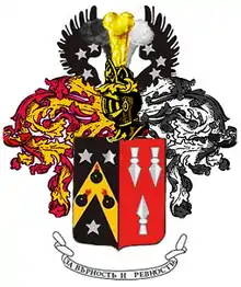 На две части вдоль разделённый щит, у которого правая часть показывает в чёрном поле золотое стропило с наложенными на нём тремя горящими гранатами натурального цвету между тремя серебряными пятиконечными звёздами, а левая содержит в червлёном поле три серебряных копейных наконечника: два вверху остриями вниз, один внизу остриём вверх.