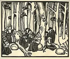 Действие происходит в «старом-старом, первобытном северном лесу под высоким звёздным небом». На небольшом расстоянии, не касаясь друг друга, сидят шесть слепых мужчин и шесть слепых женщин. Одна из женщин (слепая помешанная) держит на коленях грудного ребёнка. Рядом с ними, прислонившись к высокому дубу, сидит «в мёртвой неподвижности» пожилой священник. Вокруг растут «высокие кладбищенские деревья — тисы, плакучие ивы, кипарисы», недалеко от священника цветут асфодели.