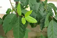 Листья чередующиеся, простые, удлинённо-ланцетовидные размерами 4–15 x 2–5,5 см, заострённые, края зубчатые, кожистые. Черешок чаще розоватого цвета, длиной 2 см, прилистники 1,5-2 см.