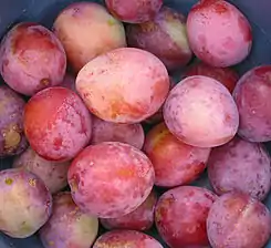Плод — однокостянка, фиолетовая, жёлтая, бледно-зелёная, красная, чёрно-синяя, с сизым восковым налётом. Косточка сплюснутая, заострённая с обоих концов.