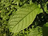 Листья очерёдные, простые, короткочерешковые, эллиптические или обратнояйцевидные, с городчатым или пильчатым краем, снизу опушённые; длина 4—10 см, ширина 2—5 см.