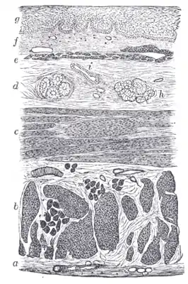 - Мышечная пластинка слизистой оболочки (лат. lamina muscularis mucosae), образована несколькими слоями гладких мышечных клеток.