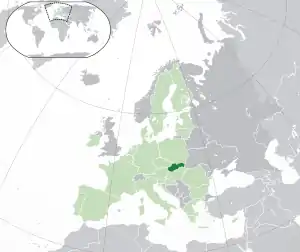 ![]() Расположение Словакии (тёмно-зелёный): — в Европе (светло-зелёный и тёмно-серый) — в Европейском союзе (светло-зелёный) |