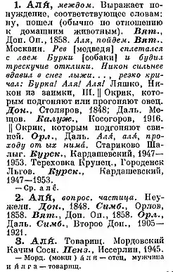 - Справочный отдел. Он помещается в конце словарной статьи за знаком тире с красной строки. В него включаются: 1) различного рода дополнительные материалы; 2) этимологические справки о заимствованных словах и в необходимых случаях сведения исторического и этнографического характера; 3) в квадратных скобках — замечания, сомнения и вопросы составителей.