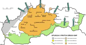1 сентября 1944 в Банской Бистрице вышел из подполья Словацкий национальный совет, который принял декларацию о восстановлении Чехословацкой республики и свержении правительства Тисо[3]. В дальнейшем город стал центром восстания.