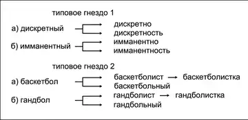 Из словообразовательных пар формируются словообразовательные цепочки и парадигмы, придающие отношениям слов в гнезде упорядоченный характер. При этом цепочки реализуют в гнезде синтагматические связи слов (горизонтальные), а парадигмы — парадигматические (вертикальные)[14].
