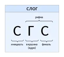 Слог состоит из слогообразующего звука, чаще всего гласного, который на схеме слога обозначен 'Г', и окружающих его нескольких неслоговых звуков, обычно согласных, и обозначенных на схеме 'С'.