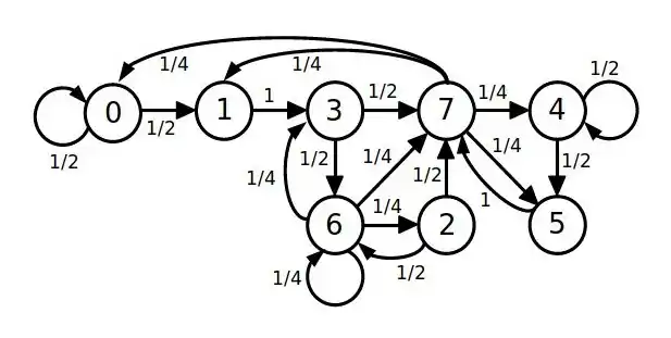 Диаграмма состояний этой системы изображена ниже. В ней кружки представляют состояния, а стрелки — переходы между состояниями. Восемь состояний этой системы, от 1-1-1 до 0-0-0 пронумерованы десятичными эквивалентами 3-битного содержимого группы из 3 ячеек: от 7 до 0. Возле стрелок переходов показаны значения прямых условных вероятностей. На схеме видна изменчивость в расхождении и схождении стрелок, что соответствует изменчивости в хаосе и порядке, чувствительности и нечувствительности, приобретении и потере внешней информации от ячеек-драйверов.