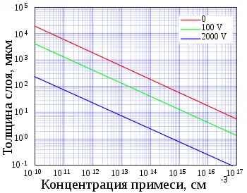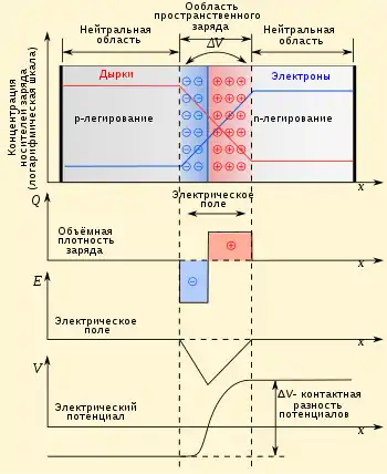 Графики концентраций электронов и дырок изображены соответственно синими и красными линиями. Серые области электронейтральны. Светло-красная область заряжена положительно, голубая зона область — отрицательно На границе областей пространственного заряда образуется обеднённый слой. Ниже на рисунке представлены графики плотности объёмного заряда, электрического поля и напряжения в переходе в зависимости от координаты.