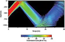 Если градиент отрицательный, происходит обратное — звуковой луч искривляется книзу. В результате образуются зоны акустической тени — зоны, недоступные для гидроакустики при использовании прямого распространения звука.