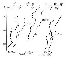 0720 — глубина 265 м, слой хорошо выражен, 2130 — глубина 250 м, 0305 — глубина 290 м, слой сглажен
