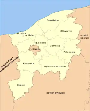 - сельские гмины: Гмина Дамница, Гмина Дембница-Кашубска, Гмина Глувчице, Гмина Кобыльница, Гмина Потенгово, Гмина Слупск, Гмина Смолдзино, Гмина Устка