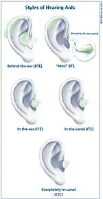 Современные слуховые аппараты являются электроакустическими устройствами и состоят из трех основных частей: микрофона, принимающего звук и преобразующего его в электрический сигнал, усилителя, принимающего сигнал от микрофона и посылающего его затем в ресивер и собственно ресивер (он же —звукоизлучатель, телефон), преобразующий электрический сигнал в звук и посылающий его непосредственно в ухо[1]. По методу передачи звукового сигнала слуховые аппараты делятся на две главные категории: костной и воздушной проводимости, при этом аппараты костной проводимости устанавливаются только в случаях тяжелого поражения слуха операционным путём. Слуховые аппараты воздушной проводимости должен подбирать и настраивать сурдоакустик или специалист сурдолог.
