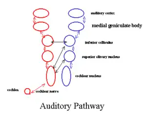 В центральную нервную систему сигнал от улитки поступает по следующему пути: преддверно-улитковый нерв, улитковые ядра продолговатого мозга, верхнее оливное ядро варолиева моста, нижние бугры четверохолмия (лежит в дорсальной части среднего мозга), медиальное коленчатое тело таламуса, слуховая кора (расположена в височной доле коры больших полушарий)[48]. Преддверно-улитковый нерв (VIII пара черепных нервов) состоит из двух ветвей (корешков) — улиткового и вестибулярного нервов: первый обеспечивает передачу акустической информации (в виде электрических импульсов) от волосковых клеток кортиева органа в мозг млекопитающего, а второй отвечает за передачу в мозг информации от аналогичных клеток вестибулярного аппарата[49].