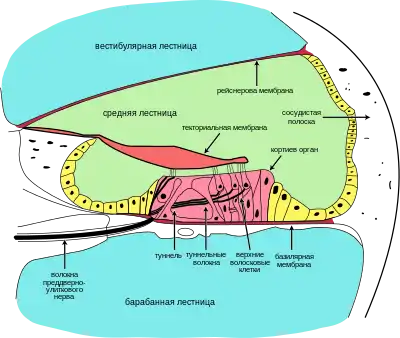 По всей длине улитки проходят три параллельных канала: два наружных — вестибулярная лестница) и барабанная лестница — и заключённый между ними более узкий улитковый канал[31][32]. Последний имеет в сечении форму треугольника, стороны которого образованы рейснеровой мембраной, отделяющей улитковый канал от вестибулярной лестницы, сосудистой полоской, образующей наружную стенку канала, и базилярной мембраной — соединительнотканной пластинкой, которая состоит из тонких параллельных коллагеновых волокон различной длины и толщины, натянутых поперёк улиткового канала, и отделяет последний от барабанной лестницы. Внутри улиткового канала располагается также текториальная мембрана — лентовидная пластинка желеобразной консистенции[33].