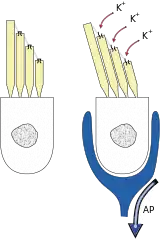 Каждая из волосковых клеток вестибулярного аппарата снабжена пучком из нескольких десятков волосков — стереоцилий; на ней также располагается более длинная подвижная ресничка — киноцилия[47]. Если под влиянием механического стимула пучок стереоцилий отклоняется в сторону киноцилии, то волосковая клетка деполяризуется, если от киноцилии — гиперполяризуется. С волосковыми клетками связаны нейроны вестибулярного ядра, активность которых меняется под влиянием нейромедиаторов, выделяемых волосковыми клетками (предположительно глутамата и/или ГАМК). Их аксоны формируют один из корешков преддверно-улиткового нерва, который следует к вестибулярным ядрам. От них информация передаётся в таламус и мозжечок, а из последних — в кору больших полушарий[45].