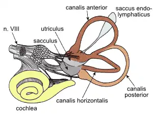 Вестибулярный отдел внутреннего уха, служащий органом равновесия, включает три полукружных канала и два лежащих в преддверии отолитовых органа — круглый мешочек и маточку, иначе называемую эллиптическим мешочком. Полукружные каналы имеют форму изогнутых полукругом трубок, заполнены эндолимфой и локализованы в костных каналах, расположенных в трёх взаимно перпендикулярных плоскостях (наличие именно трёх полукружных каналов присуще вестибулярному аппарату как млекопитающих, так и всех челюстноротых вообще, в то время как у круглоротых число каналов меньше[42]). В месте соединения с маточкой один из концов каждого полукружного канала имеет колбообразное расширение — костную ампулу, а на другом конце такого расширения нет. Маточка, в свою очередь, соединена тонким Y-образным протоком с круглым мешочком[43][44].