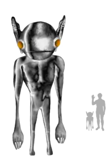Через час собака Саттонов начала беспокойно лаять. Вооружившись винтовками, Тейлор и Элмер Саттон вышли из дома и якобы увидели во дворе человекоподобное существо, приближающееся к ферме. Рост существа, по их словам, был меньше 4 футов, тело безволосое и слабо отсвечивало. У существа была большая голова с огромными жёлтыми светящимися глазами и большими плоскими ушами. Руки гуманоида, оканчивающиеся кистями, были длинными и тонкими, с когтями и неким подобием перепонок между пальцами; при ходьбе он опирался на руки. Ноги, тоже тонкие, оканчивались чем-то, похожим на присоски.