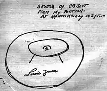Предположив, что произошла авария, Лонни вызвал подмогу. Объехав холм, Замора подъехал к объекту на расстояние 100 футов от него и заметил, что то, что он принял за машину, является яйцевидным объектом не более 15 футов в длину, соединённым с землёй чем-то, похожим на подпорки. Никаких существ больше не наблюдалось. На объекте был красный узор («знак») размером 2 на 2,5 фута: дуга, ниже «стрелка», направленная вверх, а под ней — горизонтальная полоска.